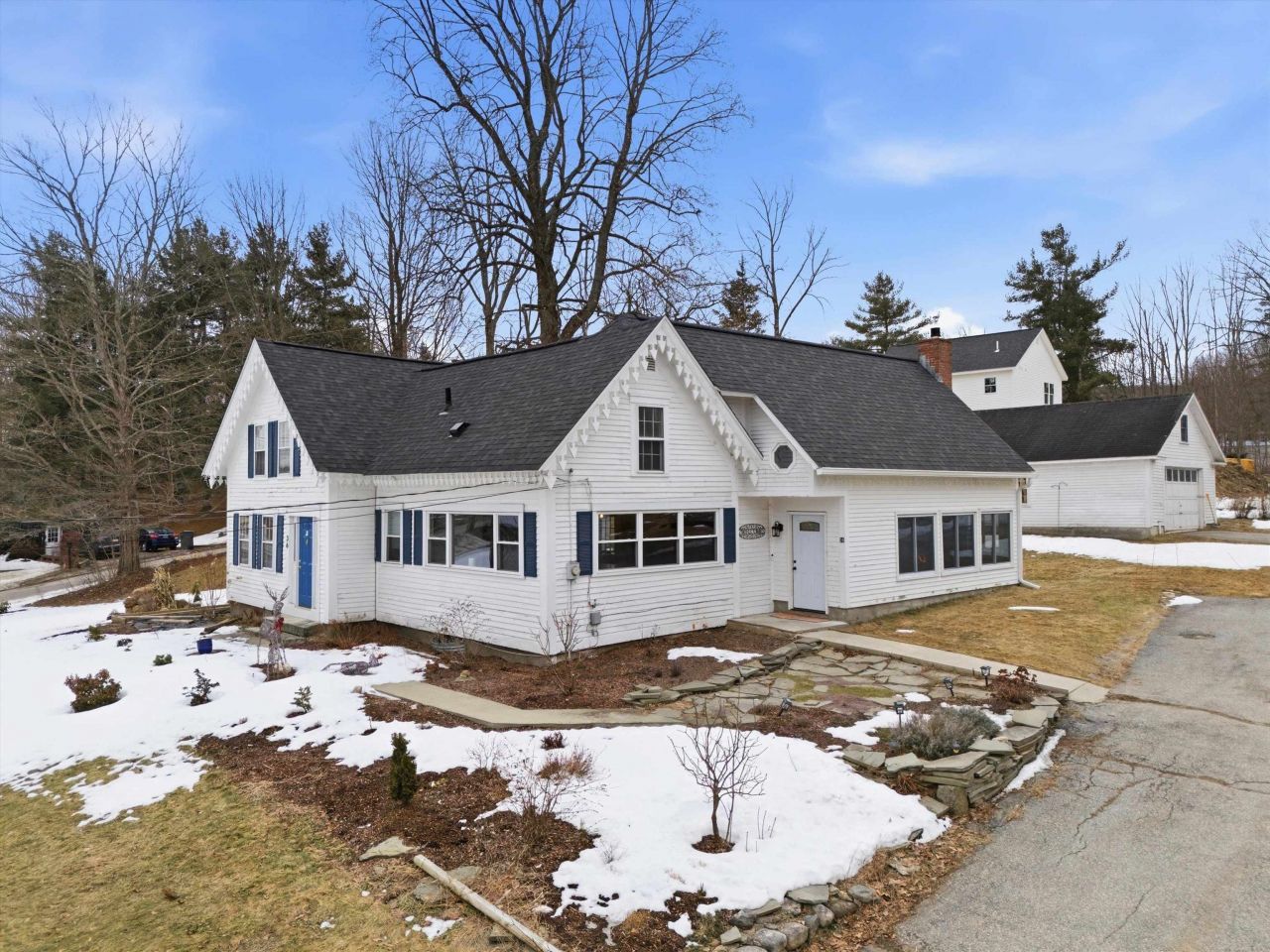 Looking for a unique home that combines historical charm, modern updates, beautiful views and gardens, and excellent indoor and outdoor work/play space? Built in 1846, this house appears in an 1886 bird's-eye view of the town, but when you step into the family room and kitchen you'll feel oh-so-modern. Both rooms feature banks of windows that welcome the natural light, and the kitchen overlooks the Souhegan River and provides a front-row seat to every sunrise, passing wildlife, and to the explosion of color from the gardens! Custom cabinets with soft-close drawers, a center island with prep sink, updated appliances, freshly refinished wood floors, and a coffee bar are key features, and the greenhouse and copious garden space mean you can create your own farm-to-table experience for festive gatherings. A living room with brick fireplace (currently unheated but easily added) offers flexibility for another bedroom or refined relaxation, and the first-floor 3/4 bath was recently updated and includes a washer/dryer. The primary bedroom upstairs is like a secret getaway, with large south-facing windows and vaulted ceiling, loads of cabinets and cubbies, and leads to a spacious dressing room/closet and into the full bath. Two more bedrooms/offices round out the second floor. You also get two barns and a garage with extra storage, all three with electricity, and that large greenhouse I mentioned is heated as well. With open space, woods, a brook, and the river, you can run as wild as your imagination. You can also walk around the corner to the park, playground, and ballfields, or to the bakery up the street. Newer roof, mini-splits, propane heater, insulation, and electrical service reduce your worries, so you can concentrate on enjoying this wonderful indoor and outdoor paradise.